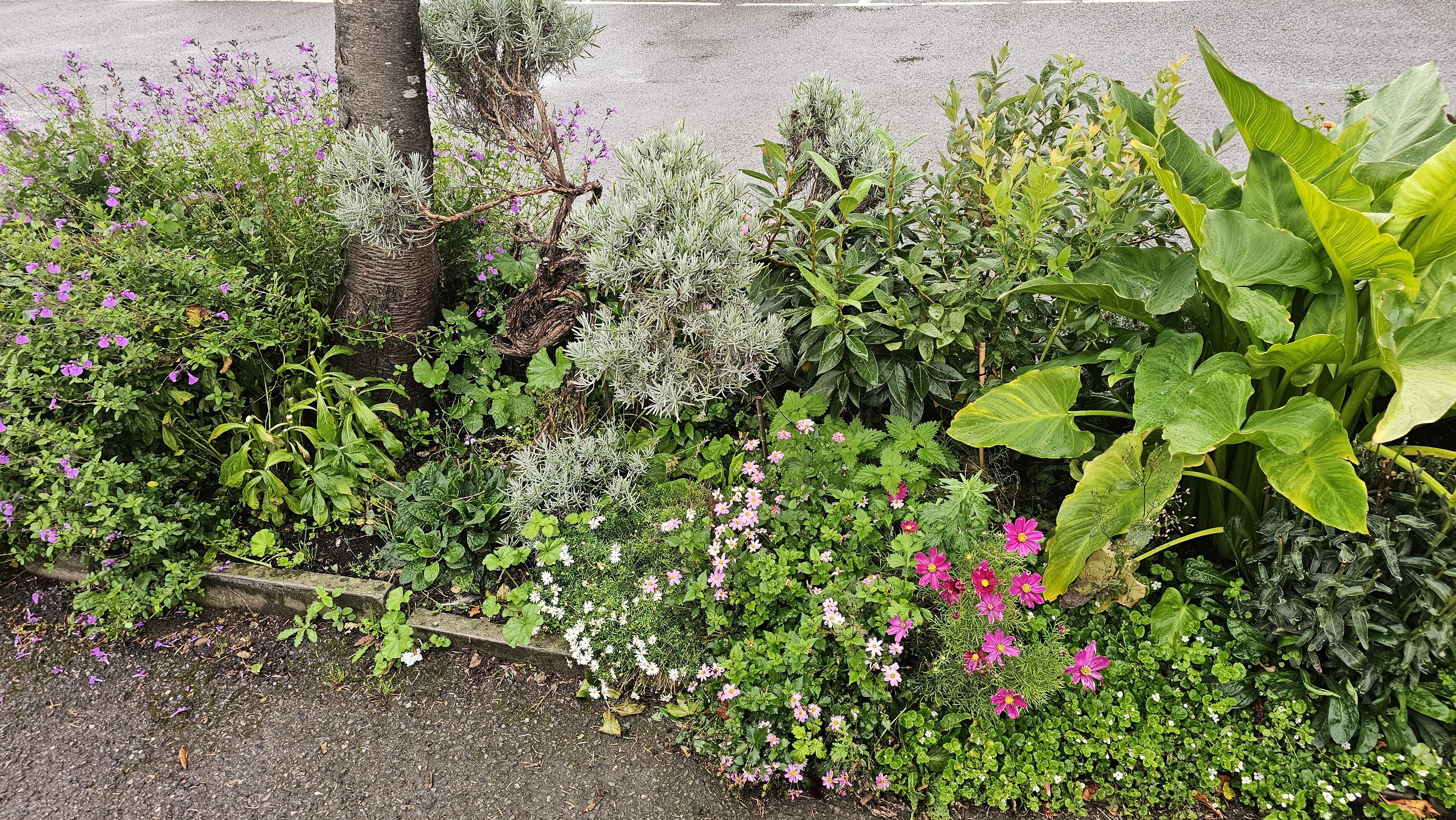 The overgrown fenced tree line was cleared of weeds and old sapplings, lots of bind weed and rocks Then I planted various different climbers, in time creating a wall of various climbing flowers, fruit and colour. The Garden Car Park is constantly changing.